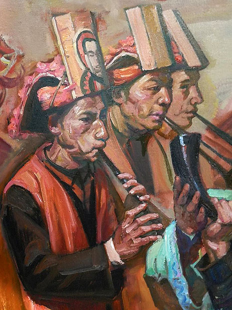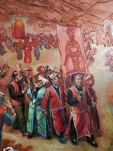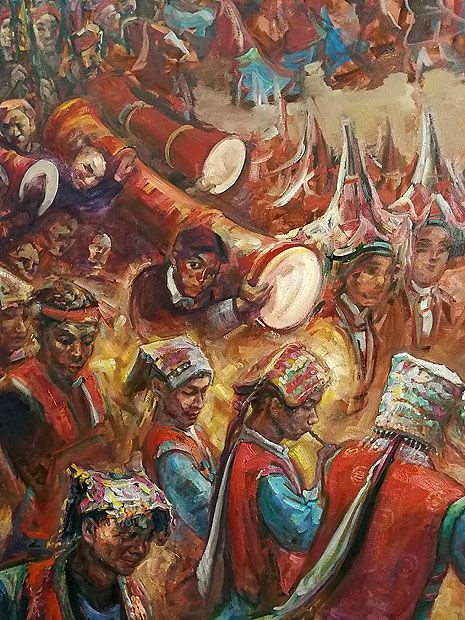 每年的农历十月十六日,祭祀男女老少都要穿上自己民族的节日盛装,聚居在一起唱歌、跳舞,欢度盘王节。他们唱的歌是以《盘王歌》为主的乐神歌;跳的舞则是每人手拿长约80厘米的长鼓群舞,一般为双人或四人对舞。关于盘王节、盘王歌以及长鼓舞,都有它们源远流长的来历。 “盘王节”是一个祭祀性节日,以“还盘王愿”和“度戒”为主要内容。“还盘王愿”是祭祀盘王,祈祷盘王的庇佑,“度戒”是瑶族男子举行的一个成人洗礼仪式。“盘王节”主要在贵州榕江塔石地区规模较大,有4000余人,统一固定在每年的农历十月十六日,一般为三天三夜,最长时间达七天七夜。“请圣”是在节日的第一天举行,由祭兵师配合师公作法请盘古大王和各界神灵到祭坛来接受主家的祭祀;“拜圣”是在第二天上午开始,是活动的高潮,要用“还愿猪”等祭品祭祀,然后由师公等几位祭祀专职人员唱《盘王大歌》并跳盘王舞;“查鬼”主要是审查那些对世间有危害的鬼,然后师公挥舞法剑斩妖杀邪;“送鬼”主要是把余下的“好鬼”送回原来所在的地方;“送盘王”就是送盘古大王回天庭。
