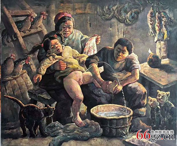 后来,根据家乡这一风俗,我创作了上面这幅油画作品,展现的就是苗族男孩“留龙窝”的主题。个人觉得,有一种冲突之美跃然纸上。