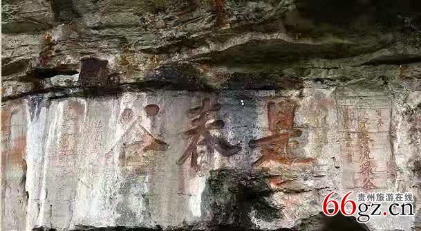 在此处的岩壁摩崖上书有“是春谷”三个大字,每个字长约0.25米,刻于清乾隆五十七年,系清代贵阳人谢庭薰于1788年致仕归里而建,它是贵州省内罕见的篇幅最大,内容最丰富的巨型摩崖,它对研究我国历史文化有很大的参考价值。
