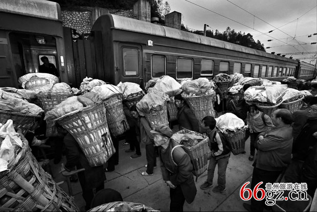 在贵州六盘水许多乡镇,每逢乡场赶集,你会在火车站台上看见这样一个已成固态模式的场景:上午8:30分点左右,凌晨6点发车由六盘水开往昆明的6061次绿皮慢车缓缓停靠在不知名的小站,火车还未停稳,早就在站台等车多时的许多当地百姓,背着装满地瓜,新鲜生姜,柑橘等农产品的立即涌到车厢门口等待上车,准备赶往几十公里外的柏果镇赶集。