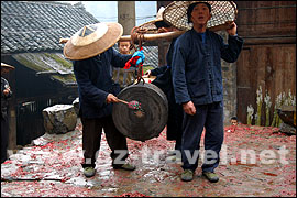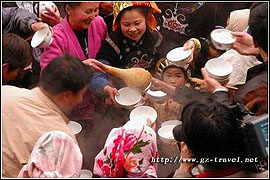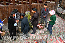 2004年2月22日农历二月初三,下午3时以后,家家户户的亲戚们,便陆陆续续的进了朗德。错落有致的吊脚楼前,不停的穿梭着肩扛手提着鸡鸭鱼肉来过节的乡亲。而来客们带的礼品,便是今天的晚餐。礼品中,一般都少不了喜庆的爆竹,鸡鸭鱼肉,还有自家酿造的米酒。
