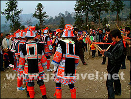 | 革家蜡染的精细在他们的服饰中充分的展示 | 跳芦笙的坝子要由寨上德高望重的老人先开场 |