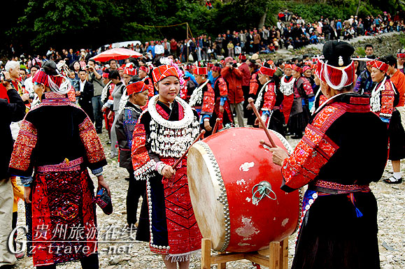 舞圈当中,最里面的一圈是年轻的未婚少女,他们从头到脚穿带了银制饰品,头戴银冠,颈带几个银项圈,有的还加项链。身穿镶满银饰的红白相间的绣花衣,下着百褶裙,她们不仅是来跳舞的,更是来赛衣,来比美。看谁的刺绣美、图案美,银饰美。由于“美”的观念,使他们头上身上的银饰,至少有七、八斤重,把人包裹起来,只露出脸蛋,因此他们的舞步很轻缓,一步一步地走,任人品头论足;中间一圈是少妇,他们穿着自己制作的盛装,带着银饰;外边两圈是男人,有年轻人,也有老年人,年轻人穿便衣,老年人多穿长袍;男人们的舞步明快而激烈,少妇们的舞步健美而豪放。 有些老人喝了些酒,微闭双眼,舞步却夸张而幽默。奇特的服饰,奇特的舞蹈,咚咚嗒嗒的鼓声,与银饰清脆的碰撞声响应,渲染出一种神秘动人的气氛。这时候,每一个来苗寨做客的游人都会被感染,情不自禁的加入到跳舞的队伍中去。