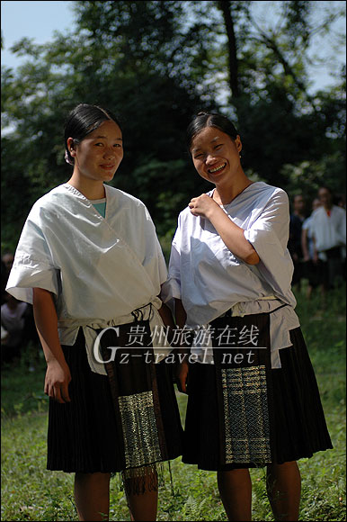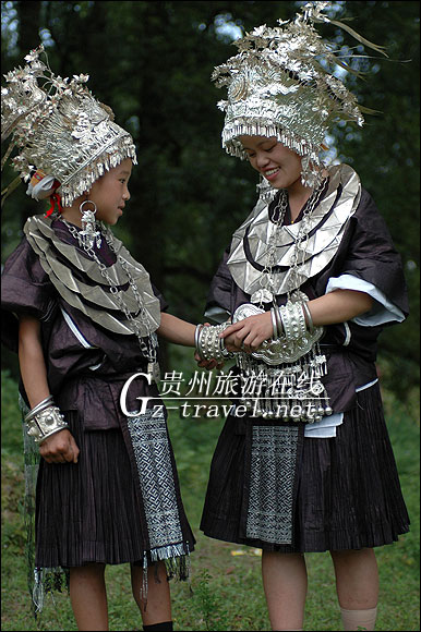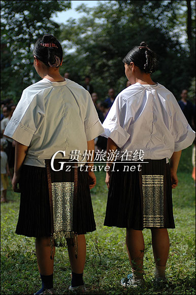 以贵州剑河县高丘乡为标本点.该服饰主要分布在高丘、新柳、展牙、南寨、观摩、反皓、等乡镇。女孩五六岁开始蓄发,至十六七岁即用酸汤洗发养发,清洗待干后用头巾包好,只有在参加节庆或走亲访友时才绾髻于脑后,并围上银箍,插银凤银花。上装为自织的自染的黑色亮布无领半袖开襟衣,衣中长,袖腰及襟边用织带装饰,衣背有一长方块锡绣几何图案,图案下端为一片包裹锡箔的丝须,穿著时交襟,右襟压在左襟外。下装为素色中长百褶裙,裙桨染直硬。穿著时系前后锡绣围腰,前围腰为丝线锡绣交织的图案,后片仅锡绣图案。穿盛装时一般颈部戴三围扁平波纹项圈、腰形银胸挂。以巾绑腿,彩带捆之。
