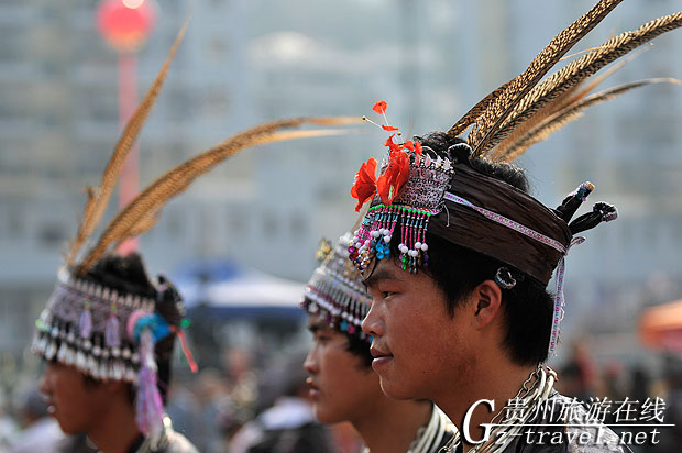 往洞镇托苗村的苗族男装特别的“妖娆”,他们把很多只使用在女孩身上的饰品都装饰在了小伙子的身上,如鲜艳的花,珠子,色彩多样而艳丽的刺绣等,但头饰上的野鸡羽毛就有象征男性的特征了。这样装束有着它独特的审美情趣和寓意。