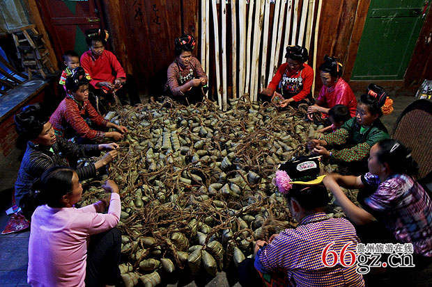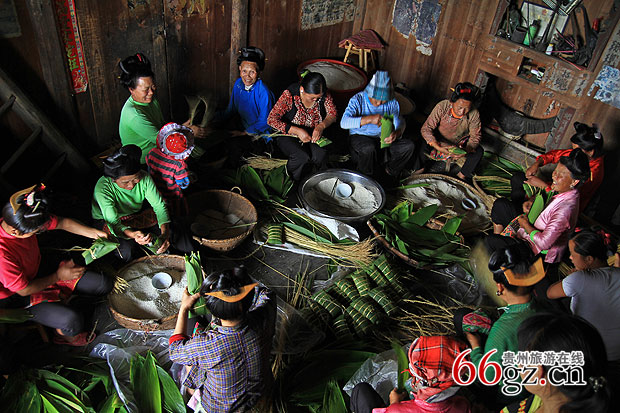 说起端午民俗,贵州苗族过端午便不得不提。苗族的端午节,又称为“龙船节”、“龙舟节”,一般在五月二十四到二十七这4天举行。这个习俗源自于一个古老的传说。相传,很久以前在清水河一带有条大黑龙,五月的一天,它抓走了一位老渔夫的独子,杀死后做了枕头。老渔夫听到消息十分悲愤,深入龙穴与黑龙进行殊死搏斗,把黑龙斩成了三截。霎时,河两岸天昏地暗。有位勤劳的姑娘摸黑到河边洗衣,随着她的捶衣声,大地重现光明。后来每年农历五月,苗族人将糯米包进粽子叶做成枕头状,在清水江边欢度龙船节,纪念这位勇敢的老渔夫和勤劳的姑娘。每当端午时节,贵州苗族村寨江边赛龙舟,场面壮观、竞争激烈,还能品尝到最地道的苗家“枕头粽”。