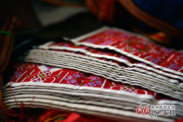 5、纹样分布: 苗族红绣服饰有便装和盛装之分。盛装可谓通身滚绣,纹样大都采用二方或四方连续的排列方式铺开,于服饰上大多分布在襟、肩、背、衣脚、袖口、袖管、臂及腰带、前后裙片等部位。