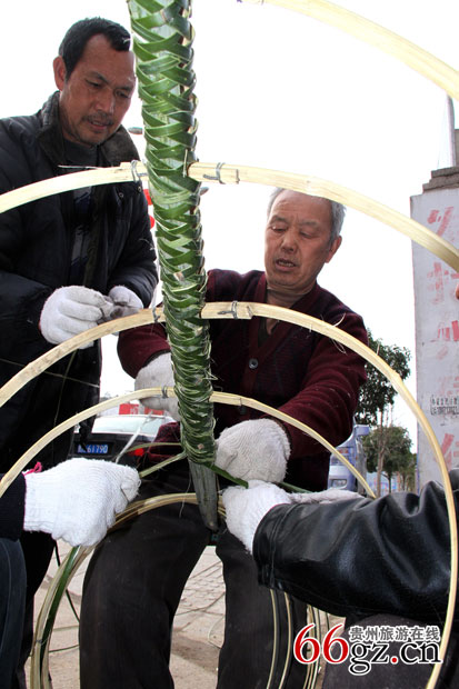 家住施秉县城沙河街七十多岁的老先生田应祥(中)是“亮龙”的传人,每年农历正月是他忙碌的日子,这是他带着两个儿子在扎“龙头”。