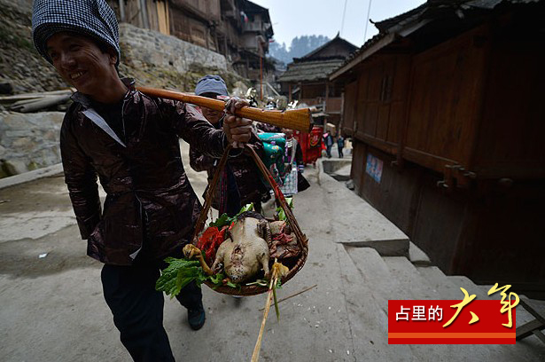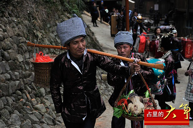 启程前往男方家,“交换彩饭”由一个男子挑在最前面