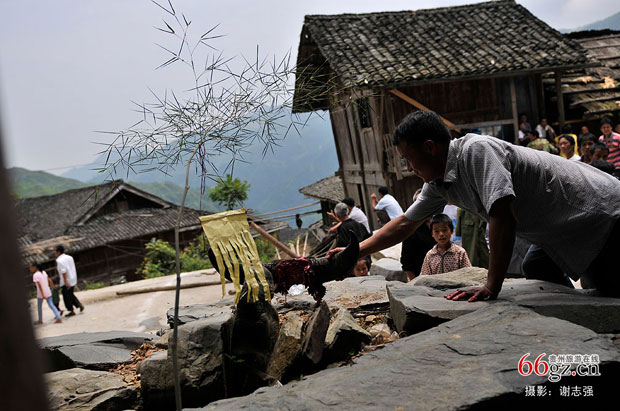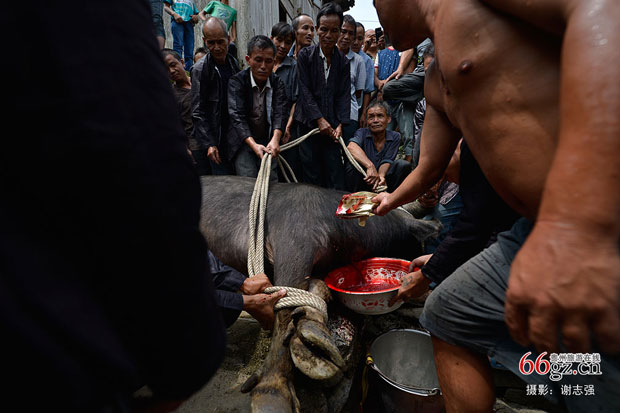 用事先做好的纸钱抹上牛血,用于供奉祖先。再割下牛角摆放在神圣的祭坛之上来祭天,仪式便基本结束。早在狩猎时代,牛就是人们重要的食物与衣物的来源,也是较容易获得到的血源。因此,用牛作祭品,是上古社会巫仪中的一种普遍仪式。