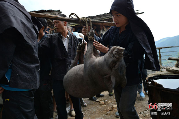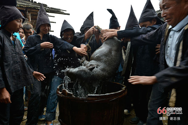 待猪溺亡之后再将血放出,另外还有一个不成文的规矩便是:若溺水三次祭猪还没有断气,便放弃溺水的方式进而选择传统宰杀。