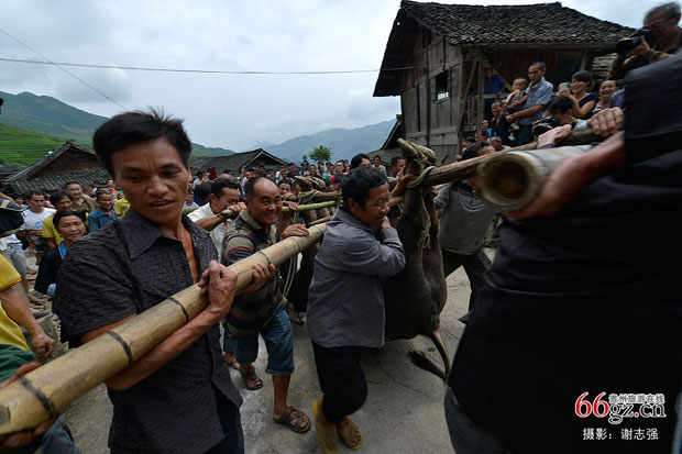 仪式的最后,要将一头水牛宰杀。用于祭祀的水牛必须选择体格健壮的,男人们把水牛五花大绑倒提固定在木棒上,事前先挖一个坑,把绑好的牛放进坑里,牛头被固定在一个简易的支架上不得动弹,随后便用斧子敲击牛的头部直至死亡。