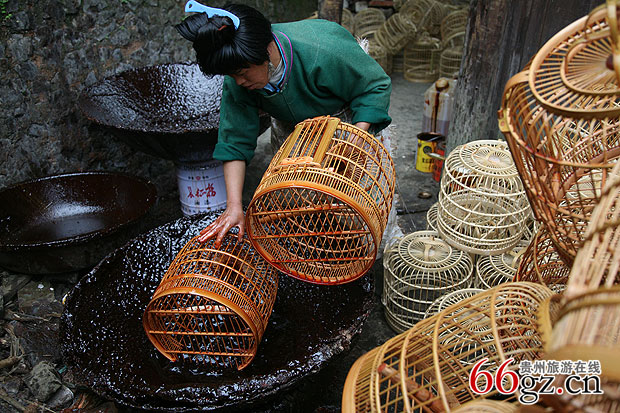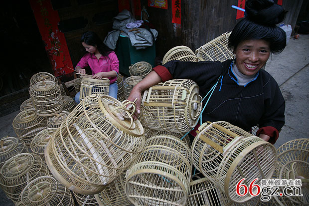 凡好养鸟者,最讲究称心如意的鸟笼。在南方的少数民族中,多有爱鸟养鸟的习俗,而鸟笼成为必不可少的用具。目前,丹寨县卡拉村已是现存为数不多的古老手工编制鸟笼专业村。据说,卡拉村的鸟笼编制已有400多年的历史。因为采用本地优质上好的楠竹为原料,所以具有不干裂、不变形、坚固耐用的特点。竹编工艺做工精巧、品种繁多、造型各异,或小巧玲珑,或美观大方,具有浓厚的地方特色和独特的艺术风格。除了普通鸟笼外,卡拉村还有集编制、雕刻、蜡染、刺绣、书法、绘画等艺术为一体的精品鸟笼,深受人们喜爱。像这样利用传统文化资源,重点发展适合自己特色的工艺品的做法,具有很好的借鉴价值。