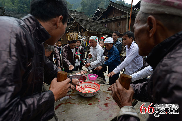 慢慢的,鼓楼周围聚集越来约多的人。一些罗汉在鼓楼里吹起了芦笙,一些待嫁的姑娘身穿盛装也出现在鼓楼的旁边。约4点四钟仪式再次开始。除了原来的寨老吴仕龙,围着青石祭坛还站着一圈其他的寨老,再外一圈则是手牵手盛装的侗家姑娘。开祭时,只见寨老烧纸、上香,口中念念有词,围着祭坛绕圈。另一个寨老吴义标开始讲述祖先的古训,大概意思“祖公的地盘好比一张桌子,人多了会垮掉;一棵树上只能有一窝雀,多了一窝就会挨饿......”,其间寨老们一起歃血为盟,一起喝酒,一起“吃”串串肉,一起应和祖训。最后姑娘们围着祭坛唱起了多耶。