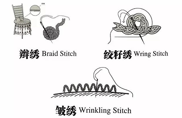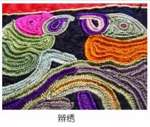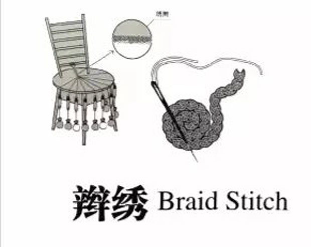 辫绣主要是贵州雷山地区的苗族使用的技法,刺绣时先将剪纸纹样粘贴在绣布上,将所用的彩线(一般是8根、9根或13根)用手工的方式辫织成3毫米左右宽的辫带,再根据图案轮廓要求,按照一定的纹理,由外向内将辫成的辫带平盘绕织盖在剪纸上,用同色彩丝线将辫带固定,图样铺满即得成品。这种技法绣出的图案,显得粗狂、厚实、野气十足。