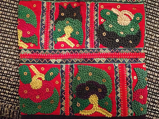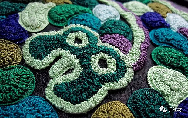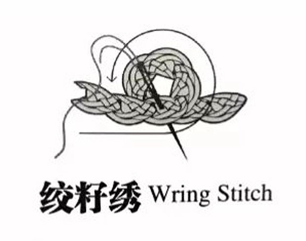 绞籽绣的前期技法与皱绣、辫绣相同,都要打辫子、贴剪纸,只是在盘钉的时候,要把辫带翻转拧结成突起的“籽”状,一个个连续突起的“籽”由外向内构成图案。