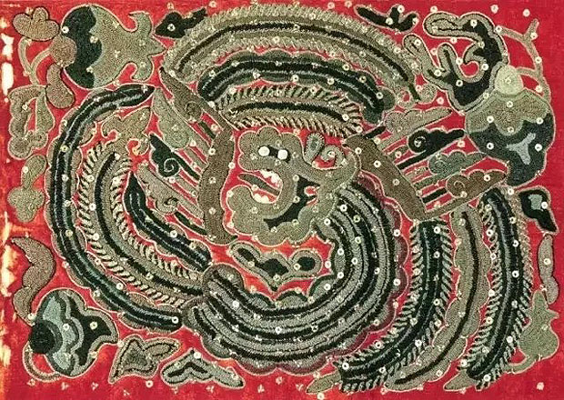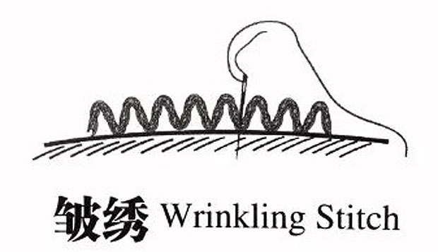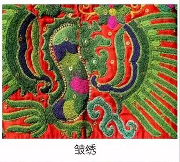 皱绣的前期制作与辫绣相同,“打辫子”,再根据图案轮廓由外至内走向,将辫带皱成一个个小褶后,用单线穿针,每一小褶钉一针,将辫带堆钉在图案上,直到铺满为止。这样绣出来的刺绣呈现出很强的立体感和浮雕感,显得浑厚、古朴,并且衣饰经久耐穿,但耗时且费线费工。