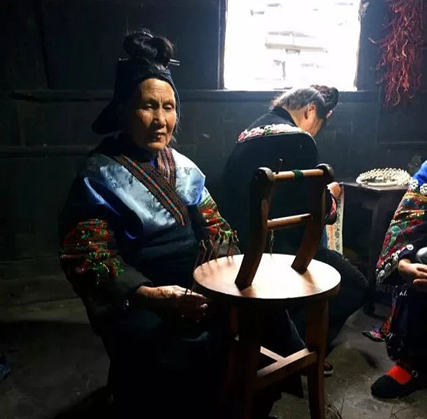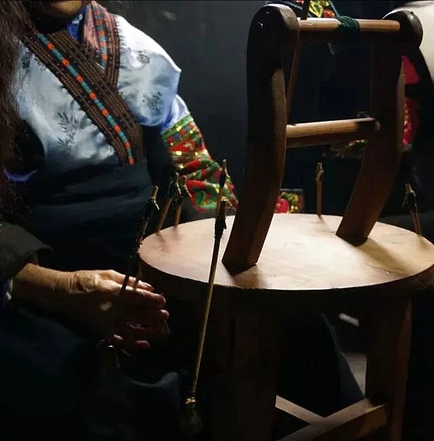 苗家阿婆巧妙的通过不同的竹棒来编出美丽的辫子。(这是“辫绣”、“绉绣”、“绞籽绣”前期都必须做的第一步工作)