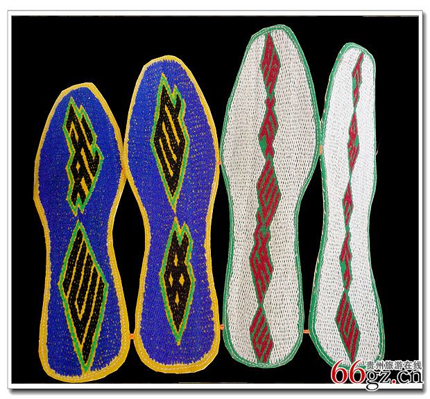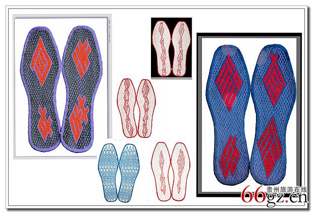 鞋垫的制作很简单,先用纸剪好鞋样,按照鞋样裁好布料(一般七、八层),用糨糊一层一层粘贴、熨平,一般用蓝、红、青布等为底,用白线或彩色丝线绣制(布依人叫“纳”),每一针一线都融入了纳鞋垫人的情感。