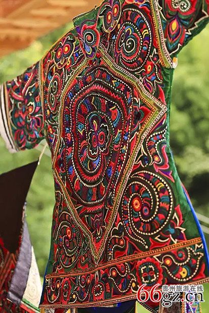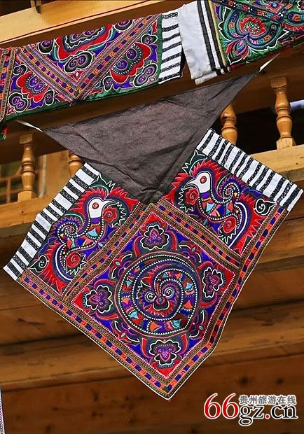 地道的民间百鸟衣,鸟图腾异彩纷呈、色彩斑斓,纹样造型粗犷、豪放、原始,充满野性。尤其是背后的图案最为精美,大多以一条盘旋的龙为轴心,外围环绕着多层鸟,整体形成一个圆形,图式古朴,千姿百态,别致传神。在苗族诸多灿烂的文化中,图腾文化是整个苗族文化不可或缺的重要部分。它独具古朴的艺术风格主要表现在衣饰上的鸟纹、鸟形,这种让百鸟云集于一身的服饰,无不散发着浓烈的原始文化气息和图腾意识,是罕见的原生态精美服饰,堪称少数民族服饰艺术之珍品。