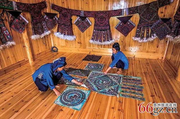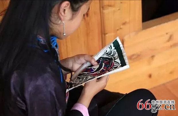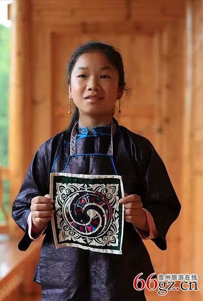百鸟衣上两只如太极图一般头尾相连的双鱼图案在苗族代表着阴阳调和,属于一种生殖崇拜的象征,在古代,是苗女绣来做定情信物之用的,但现今,这种风俗在绝大多数地方都已经消失,没想到在送陇苗寨还保存得这样完好。