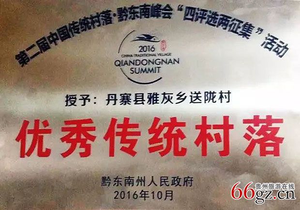 在2016第二届“中国传统村落· 黔东南峰会”“四评选两征集”活动中,丹寨县送陇村通过专家的考核与筛选,凭自己得天独厚的民族文化和景色迷人的自然风貌,最终从上百个传统村落中脱颖而出,获评“黔东南州十大优秀传统村落”美称。