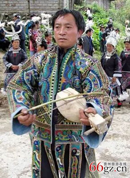 小伙身穿百鸟衣,一边演奏古瓢琴,一边展示苗家图腾文化。