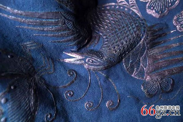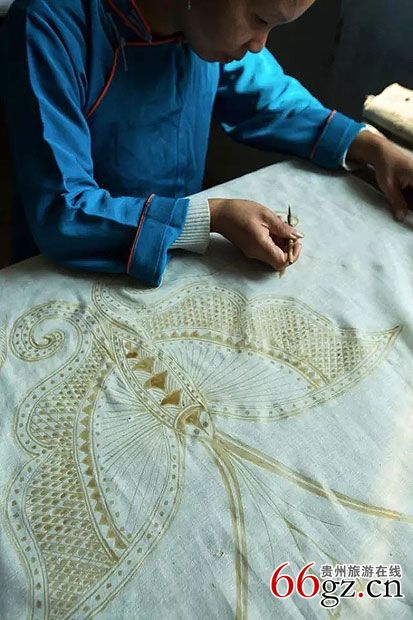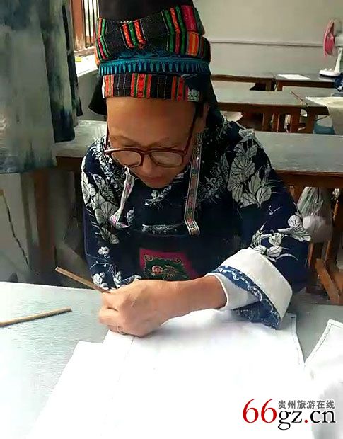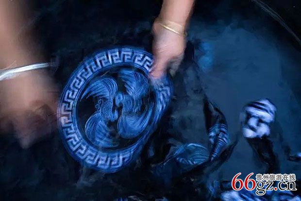 蜡染的工艺流程分为烧蜡、画蜡、染布、蒸煮、漂洗等多个步骤,画蜡只是其中一步,但却是最有创造力的一步,最终在布面上留下的纹样风格,都取决于手中的铜刀在布面上留下的融化的蜡迹。蜡迹凝固后形成天然的防染层,布面在板蓝根发酵而成的蓝靛中浸染数日,蒸煮后蜡迹融化,所在的地方留白,就形成了蓝白相间的图案。