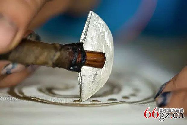 有趣的是,把融化的蜡画在布面上的工具,与其说是笔,更不如说是刀,是在细细的竹杆头上夹在一起的两片金属片,组合而成的蜡刀。金属片上松下窄,每次蘸蜡,都能够在缝隙里储存一定量的蜡液,金属片也保证了一定的温度,在蜡液凝固前,能够均匀的涂抹在布面上,灵巧的苗族女性,就用这弯弯的蜡刀,一笔一划的把心中的图案变成了身上的服装。