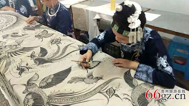 宁航蜡染的蜡画师们在共同绘制大型《百鸟图》蜡染长卷