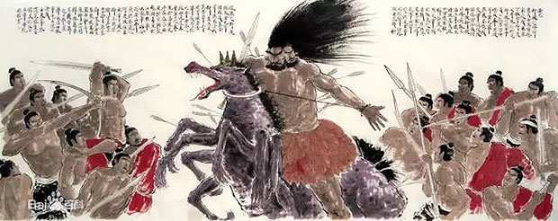 蚩尤是中国神话传说中的部落首领,以在涿鹿之战中与黄帝交战而闻名。蚩尤在战争中显示的威力,使其成为战争的同义词,尊之者以为战神,斥之者以为祸首。蚩尤也是苗族相传的远祖之一。其活动年代大致与炎帝和黄帝同时。黄帝战胜炎帝后,在今河北涿鹿县境内,展开了与蚩尤部落的战争——涿鹿之战,蚩尤战死,九黎等部族少部分融入了炎黄部族,形成了初始的中华文明。