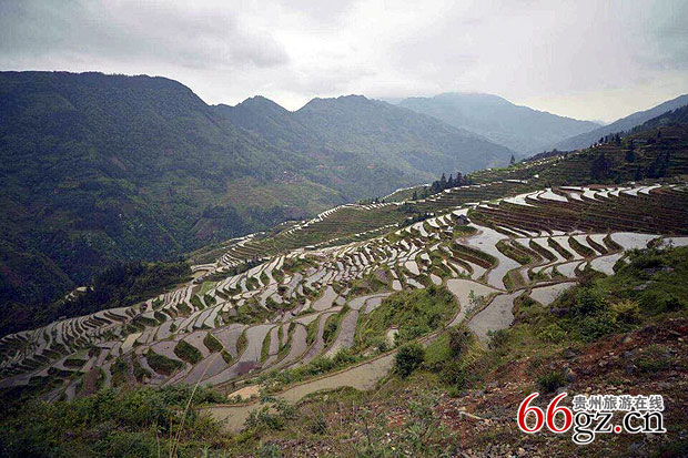 加榜梯田位于贵州省黔东南州从江县西部月亮山腹地的加榜乡东北面,距县城80公里,是中国最好梯田之一,梯田中散落着苗乡特有的吊脚楼,加榜梯田总面积近1万亩,是中国最美梯田之一。