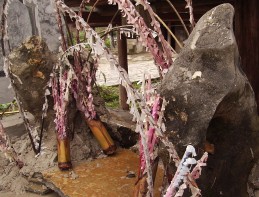 在白裤瑶族的村寨里,每家每户的门口或都立着这样的图腾石:两块中间通有洞的石头立在两边,中间再平铺一块石头,在两块石头之间用包着红纸的竹条连接起来,而逢年过节都要往洞眼里塞红纸或纸钱。其实这两个洞眼,表示的就是母性的生殖器。往洞眼里塞红纸或纸钱,是供奉母性之神,但求来日儿孙满堂,兴旺发达!从生殖崇拜上来看,最重要的一个依据则表现在白裤瑶族的婚礼“压鸡”上。白裤瑶族婚礼上有一个对学者很值得考究,对外人很神秘,对新娘和伴娘很难堪的环节,那就是“压鸡”。“压鸡”仪式举行在午夜之后,新郎家拿出一只未下过蛋的雌鸡,请出新娘、伴娘和新娘家的兄长,大家坐在桌上,新郎家派一到两个能说会道的小伙子便开始和新娘家的兄长展开“激论”了。男方会问:“今天你送新人来到我家,是为了什么?”女方回答:“送到你家就是你的人,为什么你自己知道的。”男方又指着雌鸡问:“现在是午夜了,别人都睡了,为什么你还不睡。”女方又回答:“午夜我已经睡了,是你吵醒了我啊”。其实在这里雌鸡喻为新娘,“激论”开展到一定程度时,新郎家又拿出一碗清水和一根已划成两半的短的竹棒,水碗意为女性,竹棒既是男性。双方便就此再展开了激烈的“论战”,男方会问“我现在想和你一起睡一张床,你是否同意?”,女方就回答“在家是姑娘,出嫁是新娘,到你家来了,你想怎样就怎样。”说完一次便往水碗里丢竹棒,如两半竹棒打开不一致,男方便被罚酒,如打开一致,女方则被罚酒,有时一拼就是几个小时,然后把雌鸡杀来敬伴娘和新娘的兄长,新娘是不能吃的。所谓的杀不是用刀,而是由男方的人用手压住雌鸡,不能让它动弹,也不能叫出声音来,雌鸡就这样不知不觉之中成了伴娘和新娘兄长的桌上菜。其实这个仪式主要是在期求和祝福新人家庭和睦,夫妻生活和睦,多子多福,白头偕老。