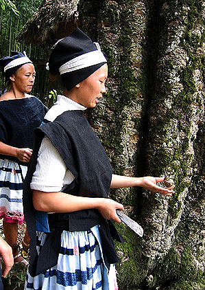 在这里有关外地人或外族人移栽都不成功的事例比比皆是。照理说,树木的成活要受土壤、气候等方面的制约,在不同的土壤和气候区移栽不成功是可以理解的。但是,南丹县城与里湖乡相距仅17公里,其根本就不会受制于土壤和气候的制约问题。然而,事实是粘膏树的确没有成活下来。还有乡政府没收的那四棵是就地移栽了,但也同样地干枯死去。很多事例表明,这种被当地白裤瑶人称之为粘膏树的植物确实是离不开瑶山的,因为只有瑶山的白裤瑶人才能栽活它。