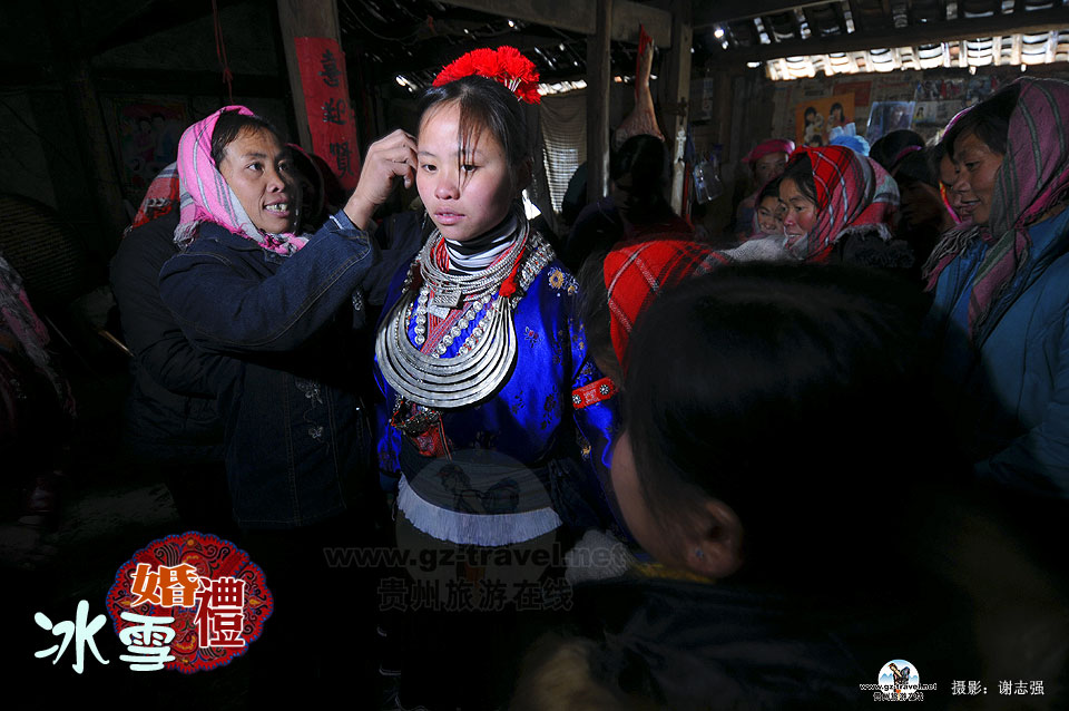 | 年三十 我们早早的就去新娘王惠坤家,还在路上,远远的就听见鞭炮声和嬉闹声,刚进门,就看见新娘的父亲正忙着贴对联,新娘的父亲告诉我,今年他家贴对联的内容也是和女儿嫁人有关系的,因为女儿嫁人,就是他家今年的大事,大喜事!房间里是热闹不已,房间外,孩子们来回奔跑,已被白色笼罩的寨子,多了更多的喜气,一条条红丝带给这个乡间带来了浓浓的祥和色彩。 待送亲队伍在新娘家吃好午饭后,新娘踩上了新铺的席子,家里的妇女给她穿上了新娘自己做的13层上衣和7层裙子。关于穿新衣也是有讲究的,衣服的层数宜单不宜双,衣服的层数越多,就代表家境好,然后身上佩戴银光闪闪的银饰,在两个伴娘的陪同下,一起前往新朗家。而在另一边,新郎家也派人来拿嫁妆了,各种家具共二十余种,装载好后,也同新娘一起走。等我们出门时,另一幕热闹的场面令我们一行意外不已。 新娘出门时,新娘的亲族兄弟个个驾着大马在外等候,他们中间小的十岁,大的十七八岁,驯马的技术可不一般。新娘的亲人挑着毯子,猪腿,一路护送,并在此期间挑的担子不能落地。马队和拉嫁妆的卡车在前开路,紧接着的唢呐手、大号手、锣鼓手一路吹吹打打,全寨老小都出来欢送,一路热闹非凡,原本在冬季更加宁静的小寨,突然热闹起来。 在送行途中,每到一定的路程,寨子里出来送行的人就要少一些,因为当了家的,又要返回家中做事,便不能再送。而娘家人在送了一半路程后也不再送,这时候唢呐手、大号手、锣鼓手随着新娘的远去,齐鸣吹奏起来。 在新郎这边,迎亲的队伍早早就等侯在约定的地方,见新娘到了,便吹起唢呐大号,敲锣打鼓的迎接新娘,一直随新娘到新郎家。在白色之景的映衬下,尽管当天气温一直在零度以下,送亲队伍在稀泥地里一直走了一个多小时,但每个人脸上洋溢着那份喜悦,言语间流露出的那份淳朴,就像田间的冰雪,那么自然,干净。 到达新郎家后,门前燃放爆竹迎新娘进屋,新朗房族中几名妇女就上前为新娘脱下盛装衣裙,挂在堂屋中竹竿上供大家观赏,向外人展示新娘的手工艺术和新娘家的富有程度。而这时候,新郎却迟迟没有出现,出于好奇,我向旁人问了问才知道,新郎和家人去寨子的各家各户送糯米饭和一片肥肉,由此表示新娘已进家了。在新娘进家后,一位年长者抓着一只鸡,拿着一碗酒,在门口念道着,请过世的祖先来“吃酒”,然后将鸡捏死,表示不吃鸡血,祈求祖先保佑这对新人安康幸福,子孙满堂。 送亲人吃过饭,喝过酒后,便又要启程返回自己家中,这时,新郎家就要给来送亲的人和马挂红,以示谢意。当天,我们跟着当了回送亲人,新郎家也给我们挂了红,于是,每人身上一条红带子,就这样红红火火的结束当天的送亲仪式。 |
