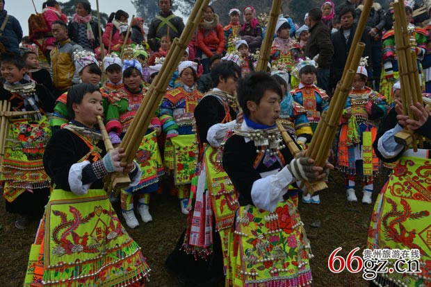 苗族小伙子尽情展示吹奏芦笙技艺,以此来吸引姑娘的注意