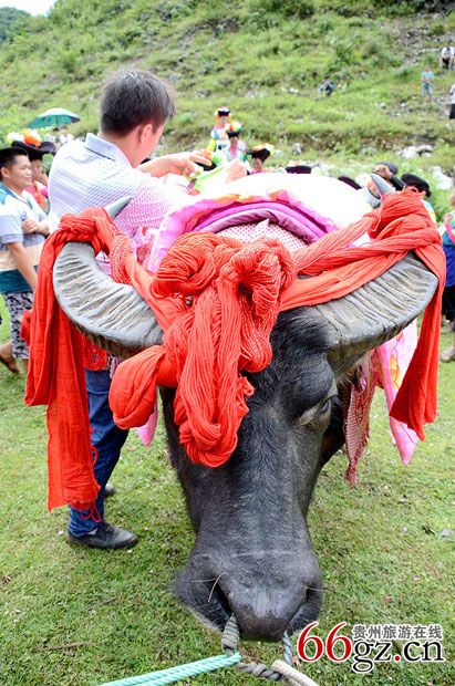 巡游时,要将亲戚们送来贺喜的毛毯、床单、踏花被捆在祭牛背上,逐一展示。