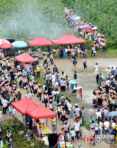 后为家门叔伯男女盛装的队伍,浩浩荡荡,沿着反时针方向绕行。队伍中不时传出“呜!”-“呜!”的助威声。