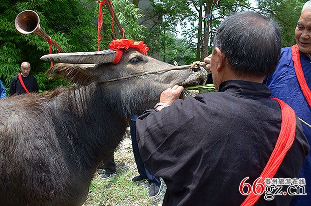 贵州省惠水县好花红镇兴涟村的布依族群众,每年的农历四月八,都要举行祭牛活动,供奉牛王,为牛沐浴,给牛喂糯米饭 包谷 嫩竹笋等精饲料,愿牛王来年再为农事勤于劳作,获取更大的丰收。