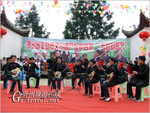 又是一年三月三,山歌飞满天。“三月三”是布依族最浓重的传统节日。特别是在黔西南州安龙县德卧、龙广镇一带,每年农历三月初三以后的第一个蛇场天,四十八寨布依村寨都要放下农活,杀猪宰鸡,进行神圣庄重的祭山扫寨活动。然后穿上节日盛装,相约来到德卧镇一个叫毛杉树的地方,与成千上万来自南北盘江一带的各族青年男女及广西隆林的壮族同胞,举行规模宏大的对山歌、舞龙狮和民间传统体育竞技活动,连续三天。未婚青年男女则通过对歌、浪哨等形成结识异性朋友,寻找意中人。