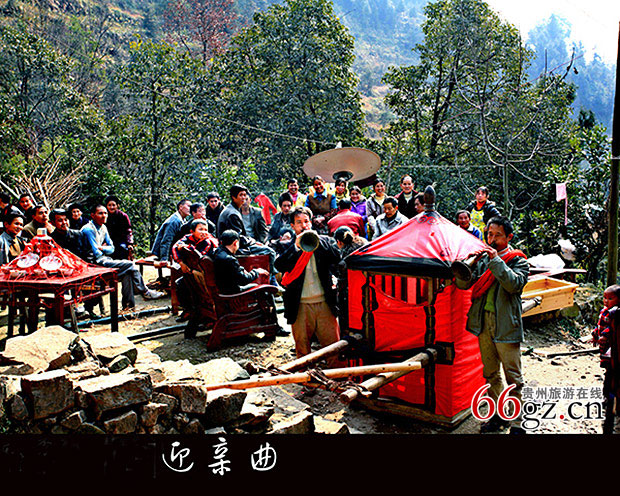 金鸡三啼到良晨,天朦朦亮时,礼官先生向内请求发轿。抬轿人将花轿抬到大门外正中间,轿门向内。在点着明亮的四个火把(轿前两把,轿后两把俗叫“喜把”)下,由土老司咬鸡冠漫血退轿煞、祭轿神。祭毕,轿内铺好坐褥,等待新娘上轿。