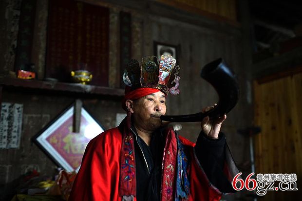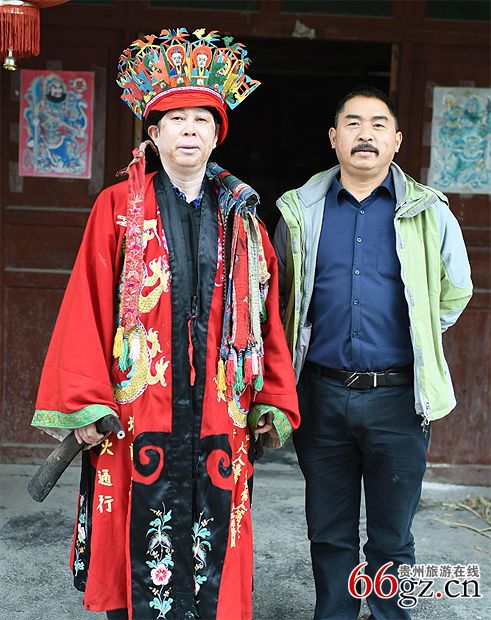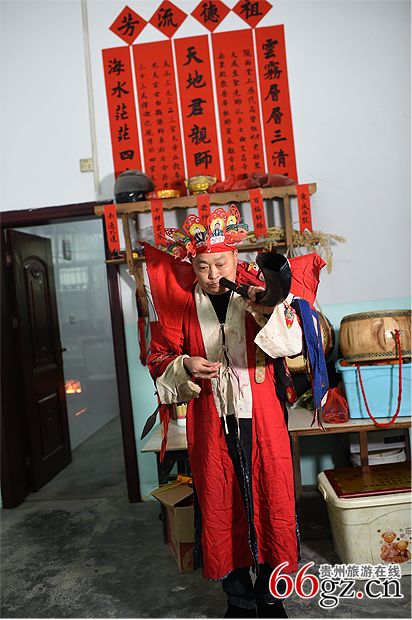 第十五站,石宗玉,70岁,家传五代,长兴堡镇。看到石宗玉,还不一定看得出他来自傩戏传承家庭,但当他穿上法衣,戴上三清帽,拿起牛角,看他的神态和动作,就知道他绝对是一位坛内多代传承弟子。