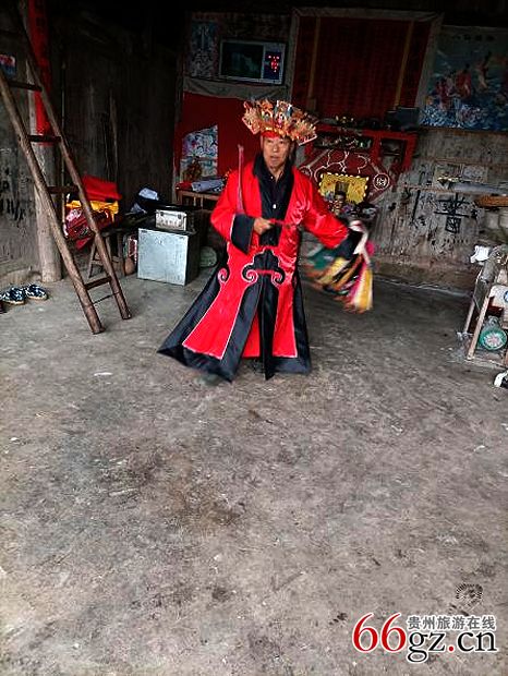第十八站,代昌前,85岁,大路镇。这不应该算着一个坛班,而是一处坛班,这处坛班就是寨冠村“梁山土地”坛班。非常有意思的是,这个村以前就有“搬梁山土地”的传统,一代传一代,最多时候达到数十人。他们的“梁山土地”与傩戏中的“梁山土地”一模一样,并且也戴面具,面具和傩戏中的一样,唱腔略有不同。据传承人讲,以前是为了生存才有了这一传统,现在不愁生存了大家就不用去了。我们问他们是否喜欢这一手艺,都表示喜欢,当时村支书就叫了好几个传承人来到代昌前家,都希望有条件可以再走出去,不为生存,只为当初内心那一份喜悦。是的,哪一种文化的出现主观上不是为了生存?岁月的变迁,他当初的作用肯定会发生变化!但愿来源于傩戏又独立于傩戏的“梁山土地”再次出现在人们面前!