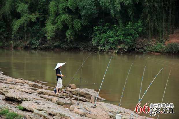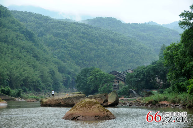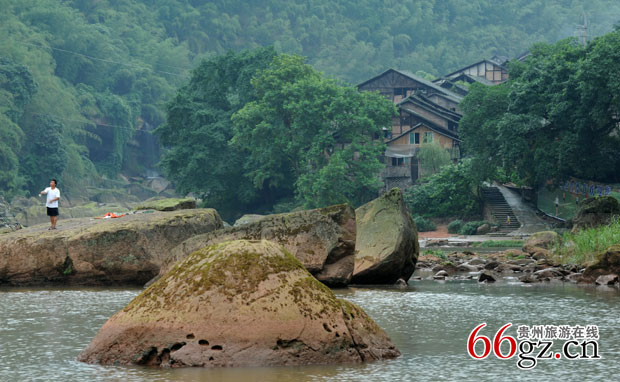 梯坎不长,但比较陡,走的人很少,梯坎两边都长满了青苔,稍不留意就会滑倒。我们小心翼翼地顺着梯坎下到河边,在梯坎的拐弯处,一尊绿茵茵的巨石赫然眼前,说它是一尊巨石,还不如说是一个染了颜色的窝窝头!它下大上小,稳当当伫立在河边,千百万年巍然不动,用它的执着见证着大同古镇的历史沧桑、兴衰荣辱......待走近一看,那巨石上绿色的东西竟然是毛茸茸的苔藓。再往下走,老人带我们来到了蛮洞子码头,指着巨石下方的一个石洞说,这就是为停泊船只栓船开凿的石洞,石洞大概只有一个拳头大小,很光滑,看得出已经有很多年头了。梯坎的左边,是一面笔陡的崖壁,崖壁上长出两颗枝叶繁茂的古榕树,树根贴着石壁往下伸展,为吸取水分,有的根须竟然使尽全身力量拼命往石缝里钻,真是“咬定青山不放松,立根原在破岩中,千磨万击还坚劲,任尔东西南北风。”这就是生命的力量,这就是抗争的勇气,抑或是石头对根的情意......它无私地接纳了树根的吮吸,分享着些许的营养,这是多么宽广而博大的胸怀呀!
