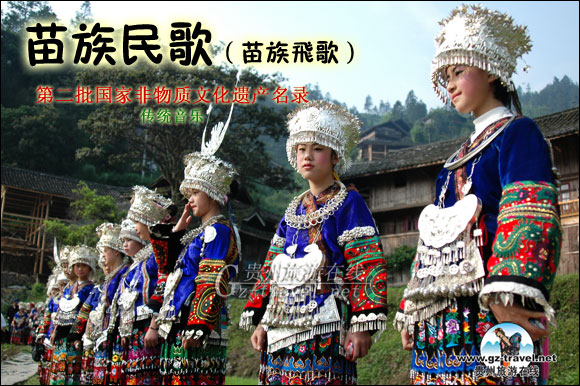 雷山苗族飞歌苗语叫hxak yat,在苗族歌海中,苗族飞歌被专家学者称之为苗歌中瑰丽的钻石,歌曲艺术的精品。它以音调明快、高亢嘹亮、豪迈奔放、悠扬婉转的曲调和动听旋律著称,它具有强烈的感染力。飞歌唱起来声振山谷,山唱谷应,翻山越岭,几里外都能听到,其名由此而得。常唱飞歌的场合是:迎宾送客的时候;劝客人喝酒的时候;互能通婚的青年男女在山坡上见面的时候以及人