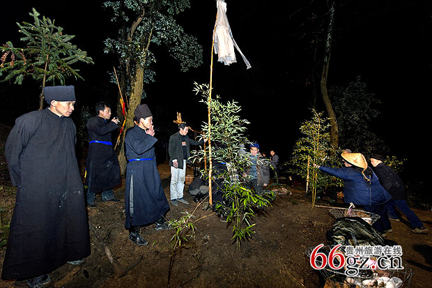 鬼师抛撒着招龙米,在山头还插上一个招龙的白纸钱