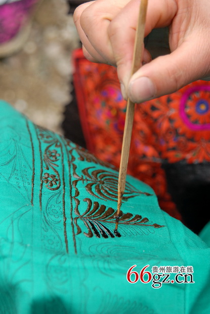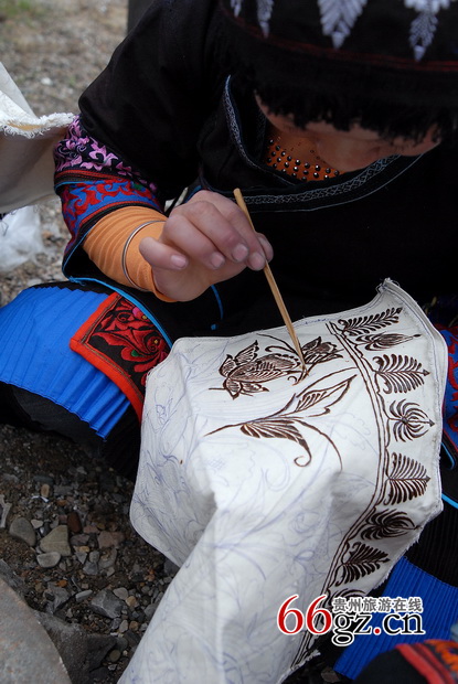 每年六、七月份,是采集枫香树脂的季节,河坝瑶族像割橡胶一样在枫香树的主干上,用半圆凿刀将树皮凿出一个V字形,在V字形下端装上一个竹筒,枫香树脂就会自动流入竹筒中,待竹筒盛满枫香树脂后取下备用。需要在自织土布上绘制时,将将枫香树脂与牛油按一定比例混合配制好的枫脂装在一只小碗里,置于较弱的炭火上保持恒温。枫脂溶解后,用自制竹签或木签蘸取枫脂,点画于事先画好的图案上,图案主要以花、草、虫、雀、鱼等为主。间以几何纹、雷纹、云纹、锯齿纹。待枫脂干后,将绘制好的布料放入盛有蓝靛燃料的木桶中浸染。这种浸染要持续八次,时间大约一星期,最后一次取出时,要投入沸水中脱脂,脱脂后拿到河边漂洗干净、阴干,便可出现蓝底白花,或青底蓝花等色彩对比鲜明的花纹图案,具有独特的民族风格和极高的艺术价值和美学价值。