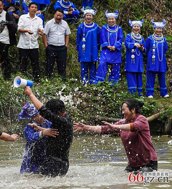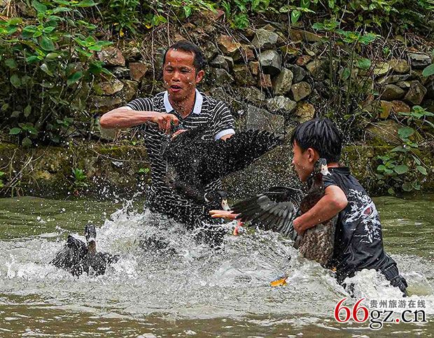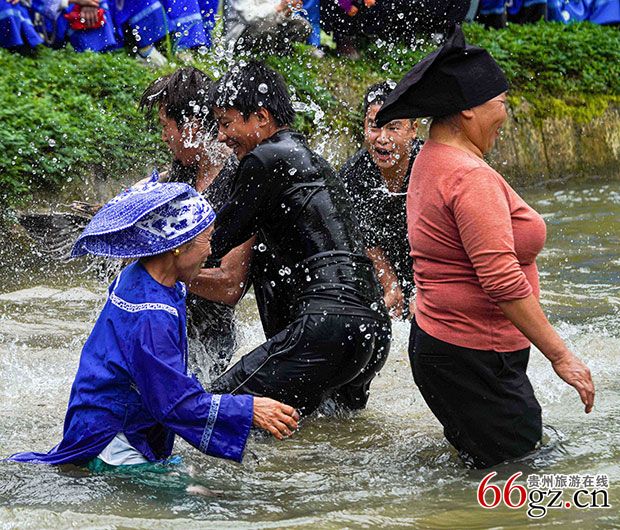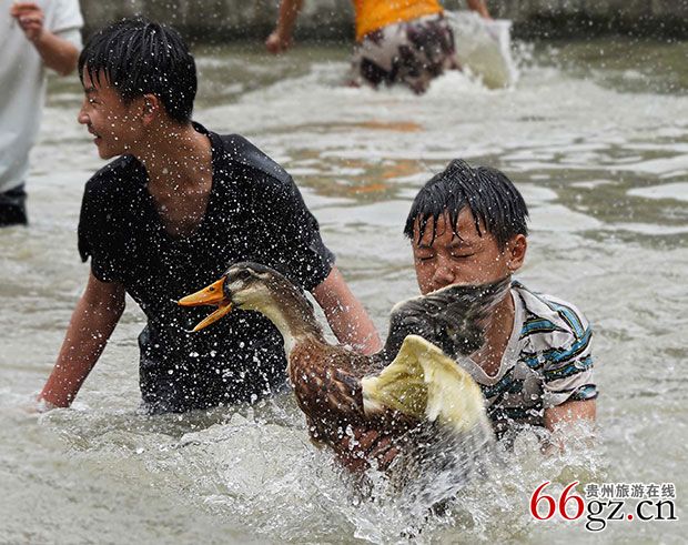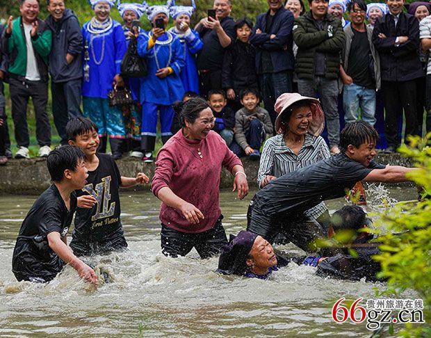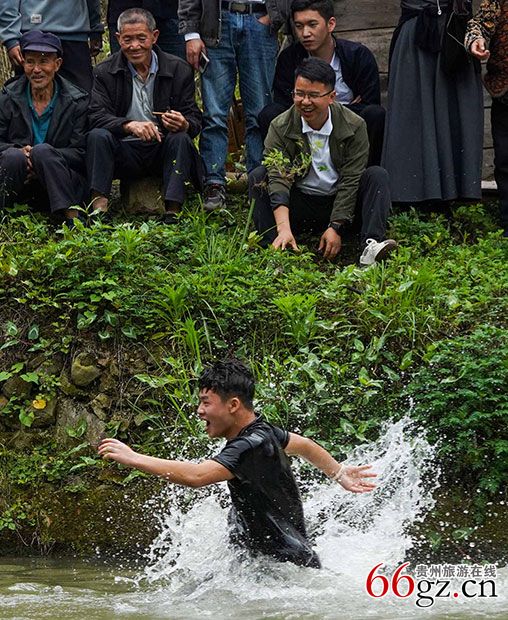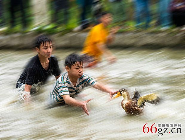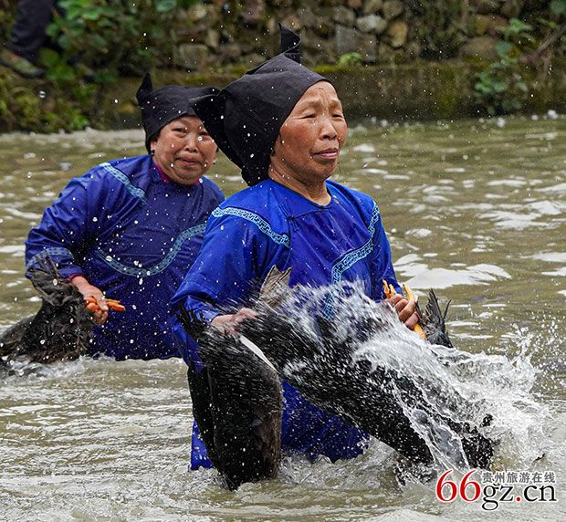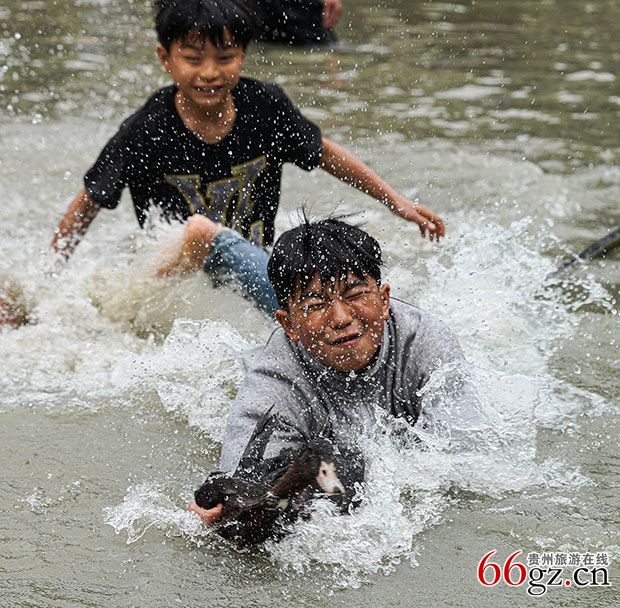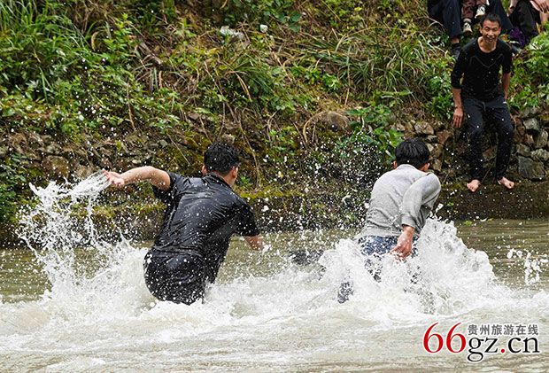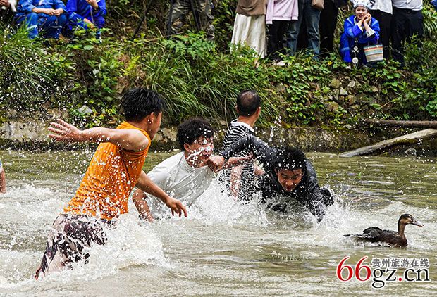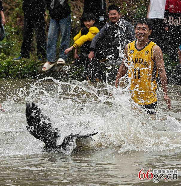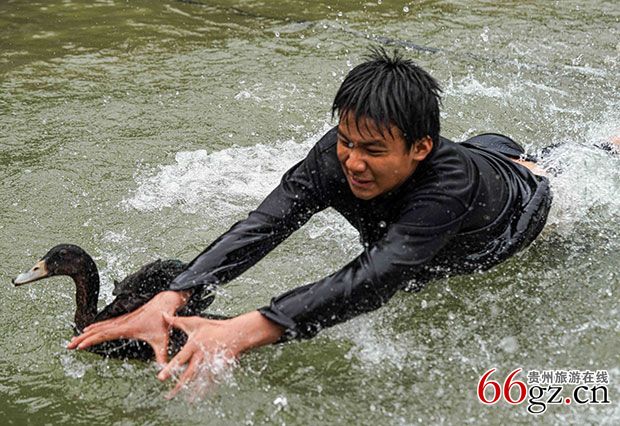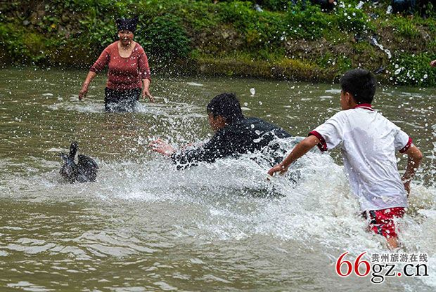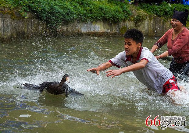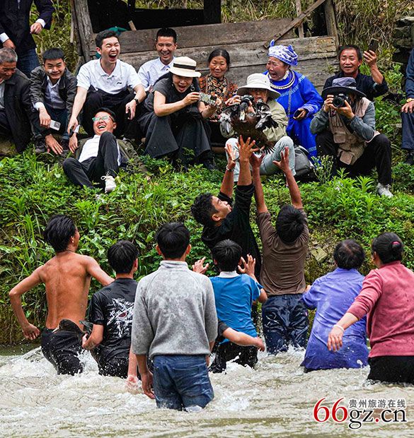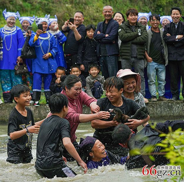 在高雍,“三月三”的娱乐回归自然本真。最激动人心的莫过于抢鸭子。随着一声吆喝,成群的鸭子被抛入稻田,不分男女老幼立刻扑进水里,溅起半人高的水花。大家你争我抢,泥水糊满了脸颊也毫不在意,欢笑声盖过了蛙鸣。这不仅是游戏,更是农耕狩猎文化的活态遗存,简单的快乐在梯田的泥水中肆意流淌。