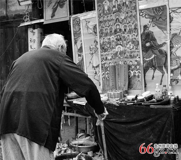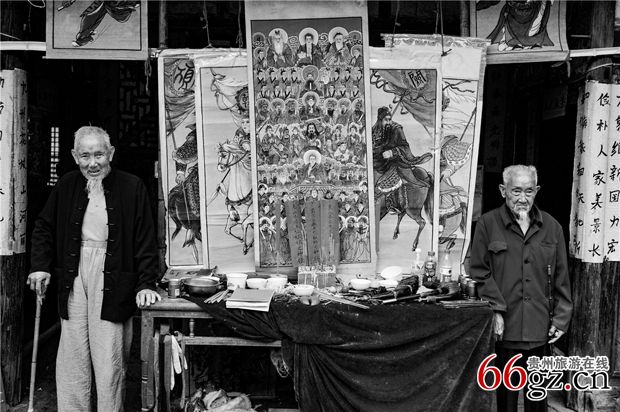 寻访人二:周万良。周万良,男,汉族,为道坪镇谷龙村一坛第16代传承者,现年91岁。83岁的同期传承人周万祥现居于谷龙村水银山组,法名周法伦。道坪谷龙一坛最早可追溯到明洪武年间,明军徐胜将军将阳戏带到平越(如今福泉)后,至今在福泉地方已传承600多年。明末清初,在福泉居住的徐家弟子第九代徐国明、徐国泰把阳戏带到道坪镇谷龙村的地心茶花田组,传承给徐法通、徐法胜、徐芝明、徐芝松、谌目堂、周大科、周洪顺、周洪钦。周洪钦晚年回老家水银山后,将其一生所学傩戏、阳戏传承给周德明、周万良、周万祥、周昌智才保存至今。