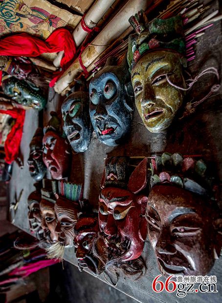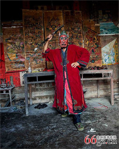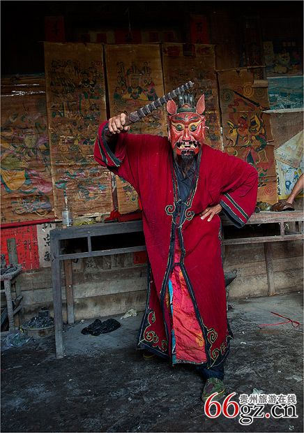 石阡非物质文化遗产傩戏传承人在表演傩堂戏
